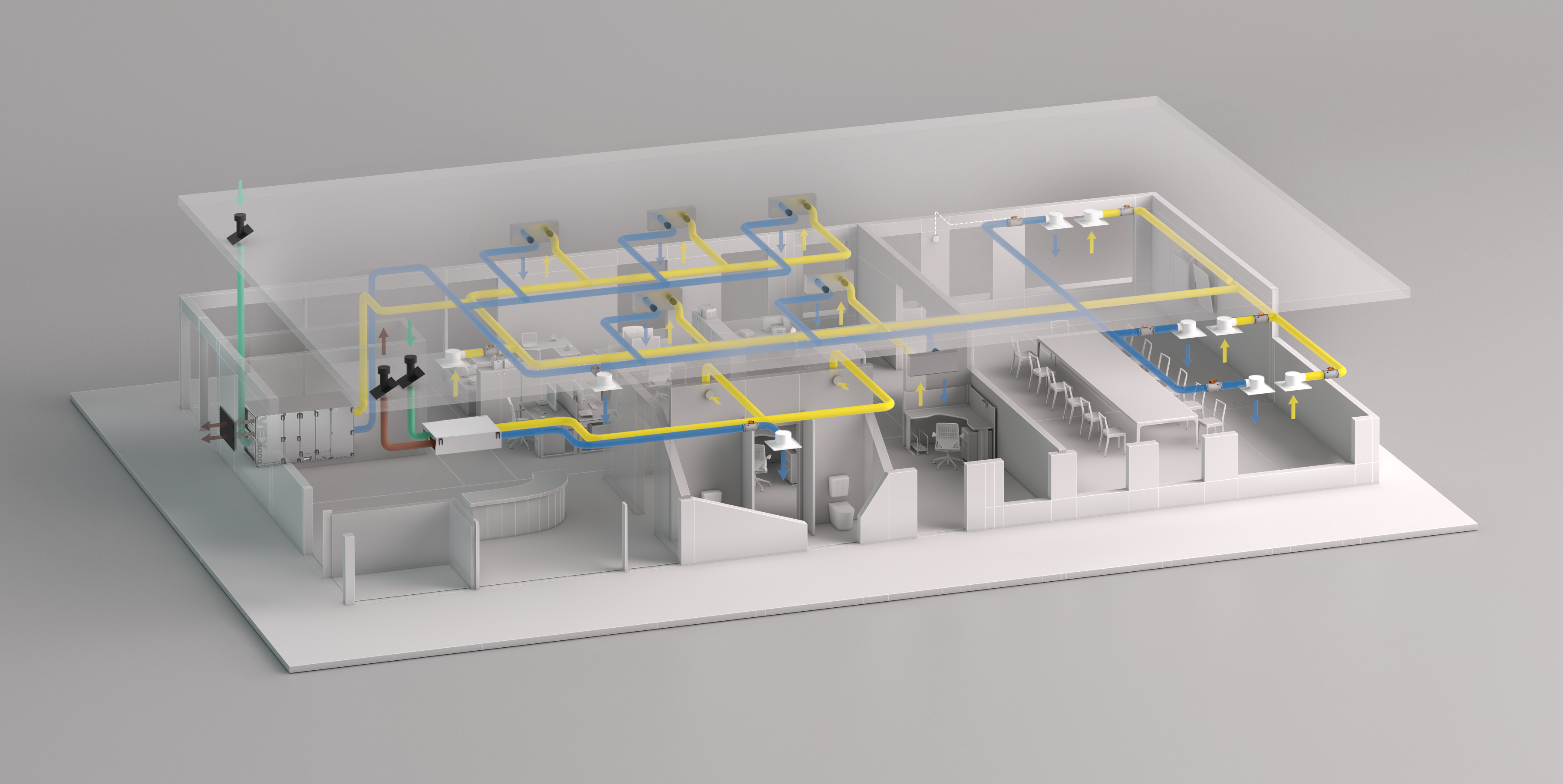 Der hohe Einfluss der Luftqualität in Arbeitsräumen auf das Konzentrations- und Leistungsvermögen der anwesenden Personen ist wissenschaftlich unbestritten. Deswegen sind Konzeptionen zur Optimierung des Raumklimas in Büros inzwischen Gegenstand jeglicher Planung von Neubauten wie auch bei Modernisierungsmaßnahmen. Der nachfolgende Beitrag zeigt wesentliche Eckpunkte einer solchen Planung und Realisierung auf. Dabei wird unter anderem auch auf die Bedeutung variabler Volumenstromregler eingegangen.