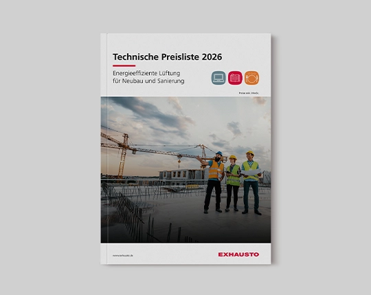 Unser technischer Katalog mit Preisen bietet Ihnen das gesamte Sortiment von EXHAUSTO und Aldes auf über 200 Seiten, inklusive vieler aufregender Neuerungen. Sie können den Katalog sowohl digital als auch in gedruckter Form erhalten. Bestellen Sie jetzt und erhalten Sie die digitale Version bequem per E-Mail-Link oder die gedruckte Ausgabe per Post.