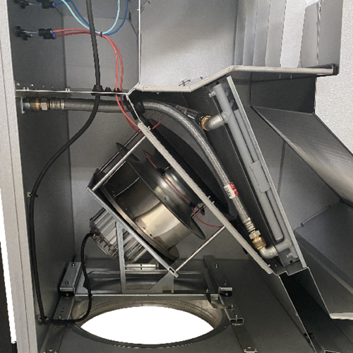 Die Motorsektionen sind an Schwingungsdämpfern aufgehängt, wodurch weniger Geräusche und Vibrationen in den Kanälen entstehen. Darüber hinaus ist es nicht erforderlich, Flexverbindungen zwischen Gerät und Kanalsystem zu montieren. Die Motorsektionen sind zwecks einfacher Wartung herausziehbar. Die Motoren sind vom Typ EC mit einem sehr hohen Wirkungsgrad, der den Anforderungen der Ecodesign-Richtlinie entspricht.