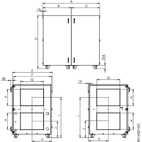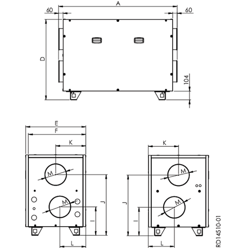 - Ohne Regelung (Option) – Das Gerät wird ohne externen elektrischen Anschlusskasten, Regelung, elektrische Verdrahtung und Sensoren geliefert. Der Kunde sorgt selbst für Elektro- und Regelungskomponenten. (Steuerungen und Motoren für rotierende Wärmetauscher, Ventilatoren und Klappen sind enthalten)