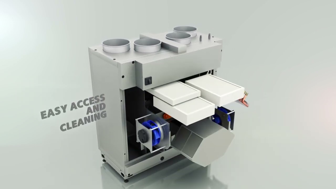 Die Konstruktion ist hinsichtlich Kompaktheit, Temperaturwirkungsgrad, Luftmenge und Energieverbrauch optimiert. Trotz der kompakten Abmessungen ist die Wartung der Anlage bei Filterwechsel, Reinigung usw. sehr einfach.